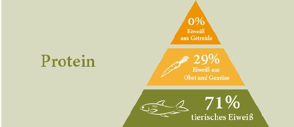 Die Bellfor-Natur Protein-Pyramide zeigt Ihnen, wie sich das Eiweiß des WILDBACH-Schmaus zusammensetzt. Viel Fisch, Obst, Gemüse und kein Getreide. So erhält Bellfor einen Proteinkomplex mit einer sehr hohen und für Ihren Hund optimalen biologischen Wertigkeit.