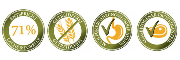 - 71% frischer Fisch (Wildlachs: 52,5%, Bachforelle: 18,5%)